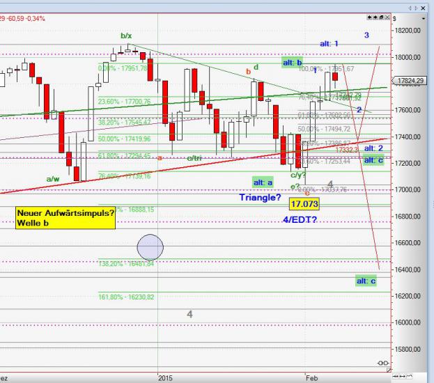 In diesem Szenario bildet die Welle der vergangenen Woche eine b/x, der noch eine Welle c mit Mindestziel 17.294 folgen kann. (Ausdehnungsziele 16.481 und 16.230).