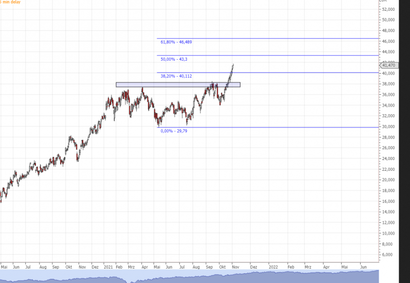 Zur Zeit „schwebt“ er bei ca. 28.600 Punkten und damit rund 1.000 Punkte über seinem alten ATH aus dem Jahr 2018. Ein Kursziel – abgeleitet von 2 Fibo-Projektionen und damit ein sog. Kleines Cluster liegt bei ca. 34.000 Punkten. Vorherige Umwege sind zum jetzigen Zeitpunkt nicht auszuschliessen, dürften aber nur eine Verzögerung darstellen.