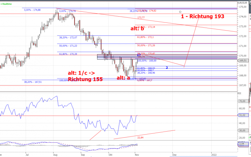 Für einen Trade ist es wichtig, dass das derzeitige Tief hält und sich zwei 5wellige Aufwärtsbewegungen ausbilden. Die erste Welle ist heute fertig geworden. Wichtig ist einen Ausbruch über 170,50 abzuwarten, der die Wahrscheinlichkeit für einen zumindest temporären Boden erhöhen würde.